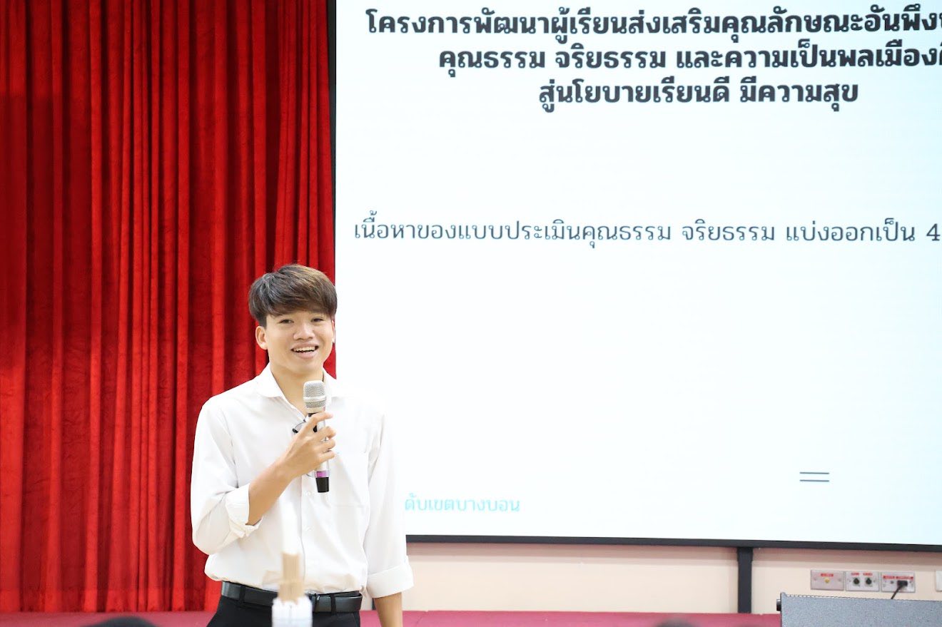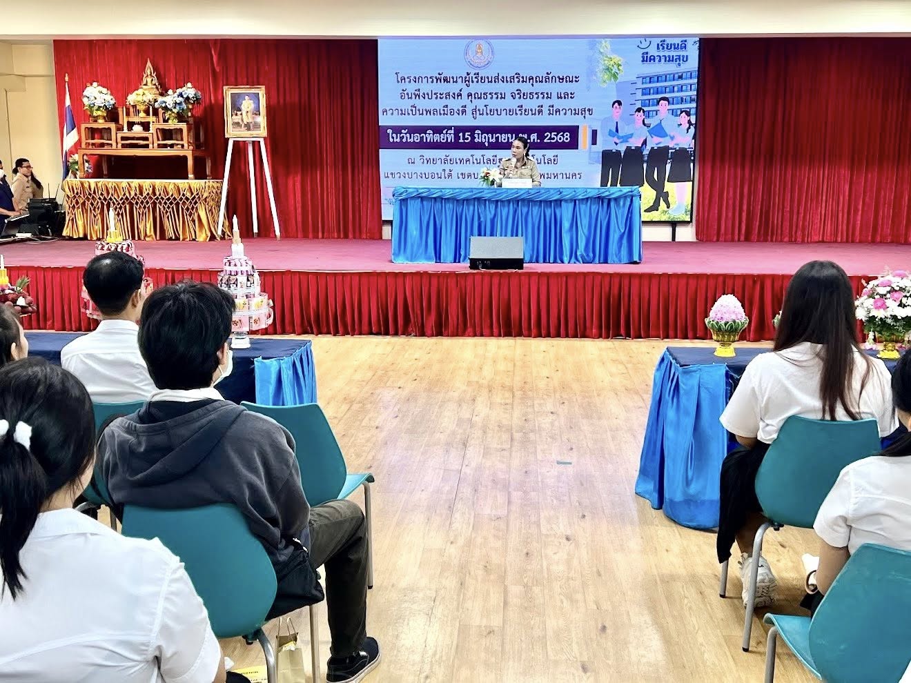 วันที่ 15 มิ.ย. 68 นางสาวบุสรา นิลเต๊ะ ผู้อำนวยการสกร.ระดับเขตบางบอน โครงการพัฒนาผู้เรียนส่งเสริมคุณลักษณะ อันพึงประสงค์ คุณธรรม จริยธรรมและความเป็นพลเมืองดี สู่นโยบายเรียนดี มีความสุข ณ หอประชุมอาคารยานยนต์มหาชัย วิทยาลัยเทคโนโลยีฐานเทคโนโลยี แขวงบางบอนใต้ กรุงเทพ ฯ