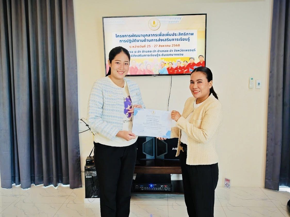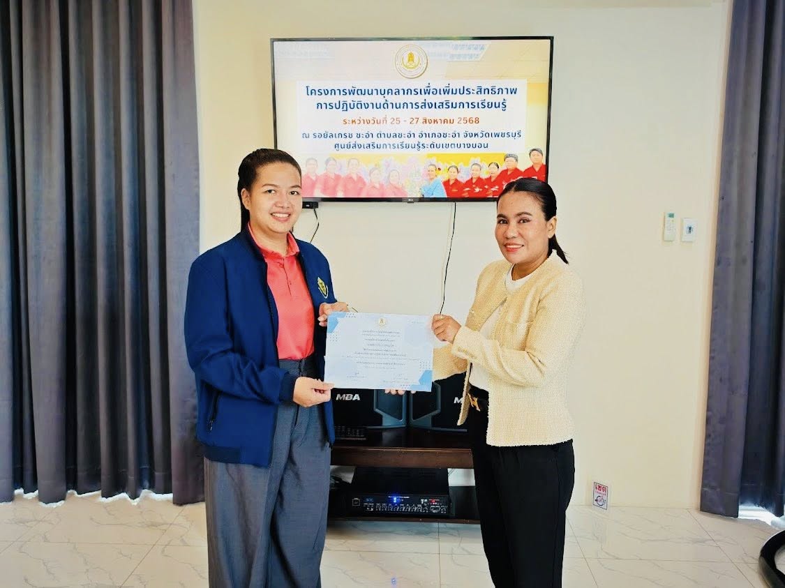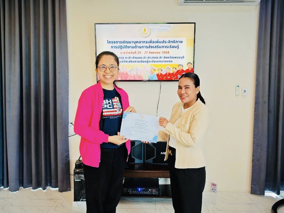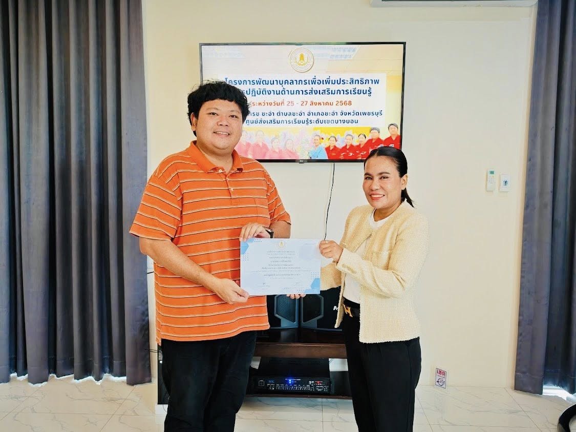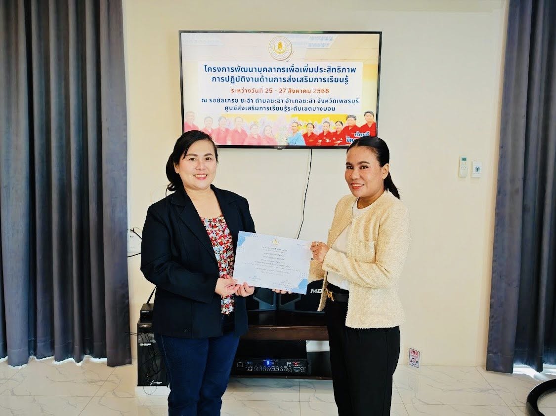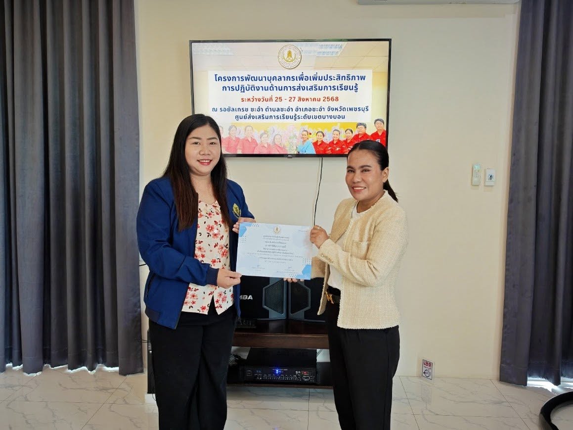 วันที่ 27 สิงหาคม 2568 นางสาวบุสรา นิลเต๊ะ ผู้อำนวยการ ศูนย์ส่งเสริมการเรียนรู้ระดับเขตบางบอน นำข้าราชการครู คณะครูศูนย์ส่งเสริมการเรียนรู้ ครูศูนย์การเรียนชุมชน และบุคลากร ดำเนินโครงการพัฒนาบุคลากรเพื่อเพิ่มประสิทธิภาพการปฏิบัติงานด้านการส่งเสริมการเรียนรู้ ณ รอยัลเกรชชะอำ ตำบลชะอำ อำเภอชะอำ จังหวัดเพชรบุรี