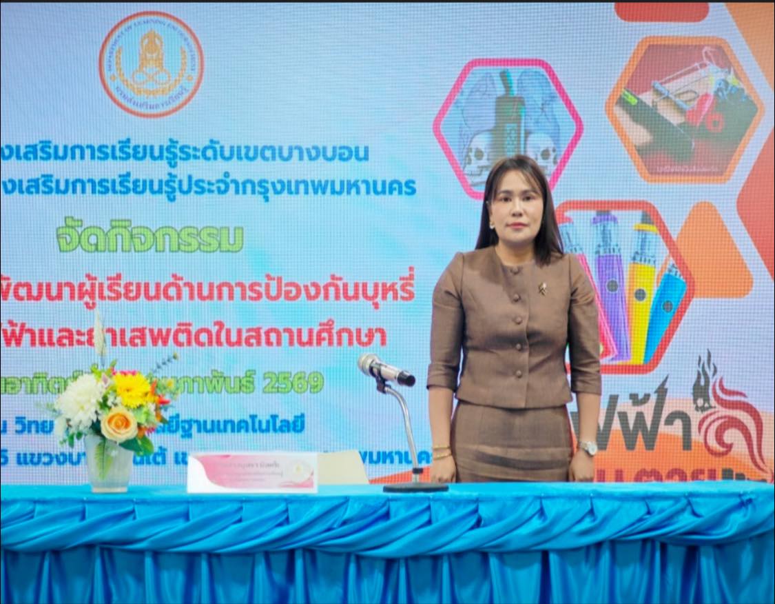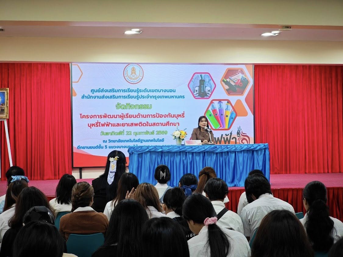 วันที่ 22 กุมภาพันธ์ 2569 นางสาวบุสรา นิลเต๊ะ ผู้อำนวยการ ศูนย์ส่งเสริมการเรียนรู้ระดับเขตบางบอน มอบหมายนายวิทยา เจือจันทร์ ครู ศกร. และคณะบุคลากร ดำเนินโครงการพัฒนาผู้เรียนด้านการป้องกันบุหรี่ บุหรี่ไฟฟ้า และยาเสพติดในสถานศึกษา โดยมีผู้เรียนเข้าร่วมโครงการจำนวน 300 คน ณ ห้องประชุมอาคารยานยนต์มหาชัย วิทยาลัยเทคโนโลยีฐานเทคโนโลยี แขวงบอนใต้ เขตบางบอน กรุงเทพมหานคร