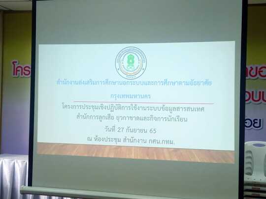 วันที่ 27 กันยายน 2565 นางสาวบุสรา นิลเต๊ะ ผู้อำนวยการ กศน.เขตบางบอน มอบหมายให้นายจิระวัฒน์ วัฒนะกูลอิทธิ นักวิชาการศึกษาเข้าร่วมโครงการประชุมเชิงปฏิบัติการใช้งานระบบข้อมูลสารสนเทศสำนักการลูกเสือ ยุวกาชาดและกิจการนักเรียนของสำนักงาน กศน.กทม. ประจำปีงบประมาณ 2565