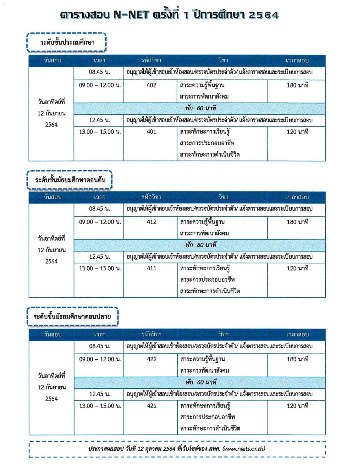 ตารางสอบ N-net ภาคเรียนที่ 1/2564